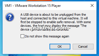 Nama perangkat USB yang diberikan oleh VMware Worstation Player sering berbeda dengan nama yang diberikan oleh sistem operasi Windows 7 atau Windows 10. Di sistem operasi Windows, nama perangkat USB bisa dilihat di Device Manager. - Jika ada pesan berikut, klik “OK”. Klik “Do not show…” jika tidak ingin pesan tersebut mincul lagi.