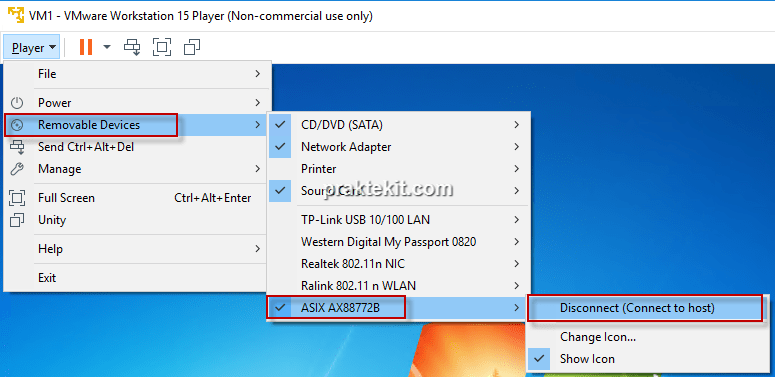 VMware Worksatation Player memungkinkan virtual machine untuk terhubung ke perangkat USB. Ketika ada perangkat USB terpasang di port USB komputer Host, maka akan ada pilihan apakah akan menghubungkan perangkat USB tersebut ke komputer Host atau ke virtual machine, artinya suatu perangkat USB tidak bisa dipakai di waktu yang sama oleh komputer Host dan virtual machine. Cara Instal Perangkat USB di Virtual Machine VMware Workstation Player. Perangkat USB yang akan diinstal adalah USB LAN Edimax EU-4208.